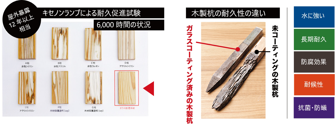 圧倒的な耐久性を誇るニッコー・液体ガラス。キセノンランプによる6000時間の耐久促進試験では、 他と比べて圧倒的に劣化が少なく、その差は一目瞭然です。屋外暴露12年相当の試験でも、 他と比べ退色や劣化することなく、美しい状態を保っています。 また土に打ち込まれた木製杭でも、このように腐食を防ぎ圧倒的な耐久性を誇ります。