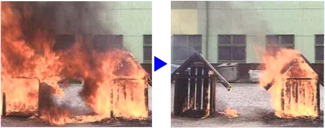 ファイアーカットを塗布した小屋 (写真左)はガソリンだけが燃え、引火や延焼を防止。 紙ヤスリで元の木目がよみがえります。 ファイアーカットを塗布した木材にガラス改質処理を行うことで、美観を損なう白華現象を抑止。木材の活用範囲が広がります。