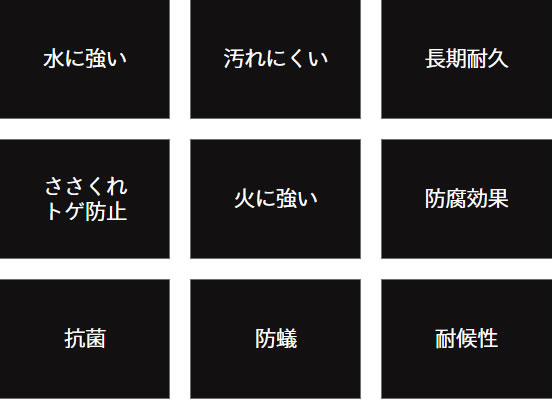 コンクリートの強化をはじめ、最も難しいとされた木材の改質を無害・無公害・無添加で再現させ、 圧倒的な長期耐久性に加え、腐らない・白蟻に食われない・退色しないという常識を変える商品化を実現しました。