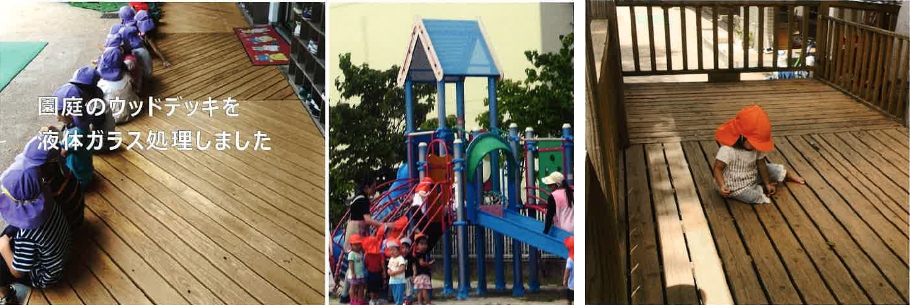 ニッコーの液体ガラスは薬剤自体が無害なので、子供がいる環境でも安全です。 また、ガラスコーティングした木材は時間が経過してもトゲやささくれがでないので、保育園などでも使用されており安心です。